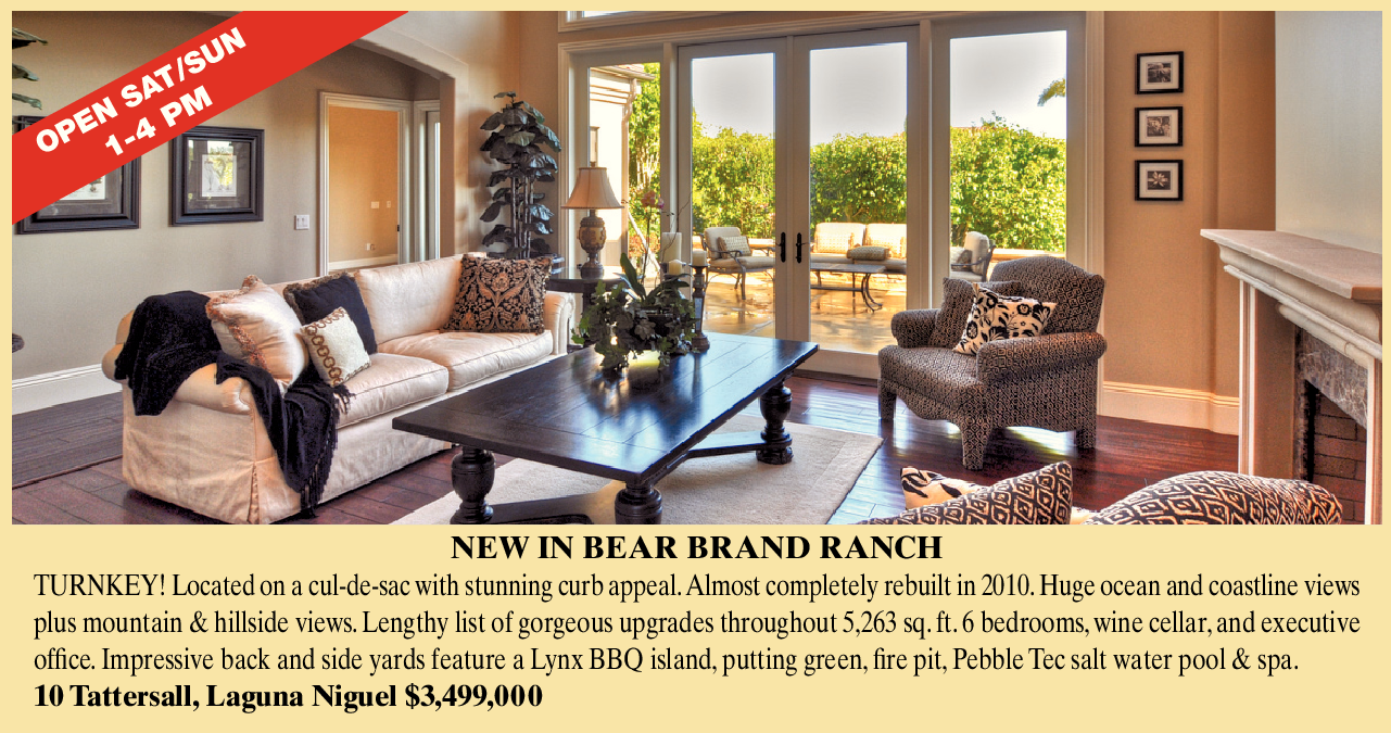 NEW IN BEAR BRAND RANCH TURNKEY! Located on a cul-de-sac with stunning curb appeal.Almost completely rebuilt in 2010. Huge ocean and coastline views plus mountain & hillside views. Lengthy list of gorgeous upgrades throughout 5,263 sq. ft. 6 bedrooms, wine cellar, and executive office. Impressive back and side yards feature a Lynx BBQ island, putting green, fire pit, Pebble Tec salt water pool & spa. 10 Tattersall, Laguna Niguel $3,499,000