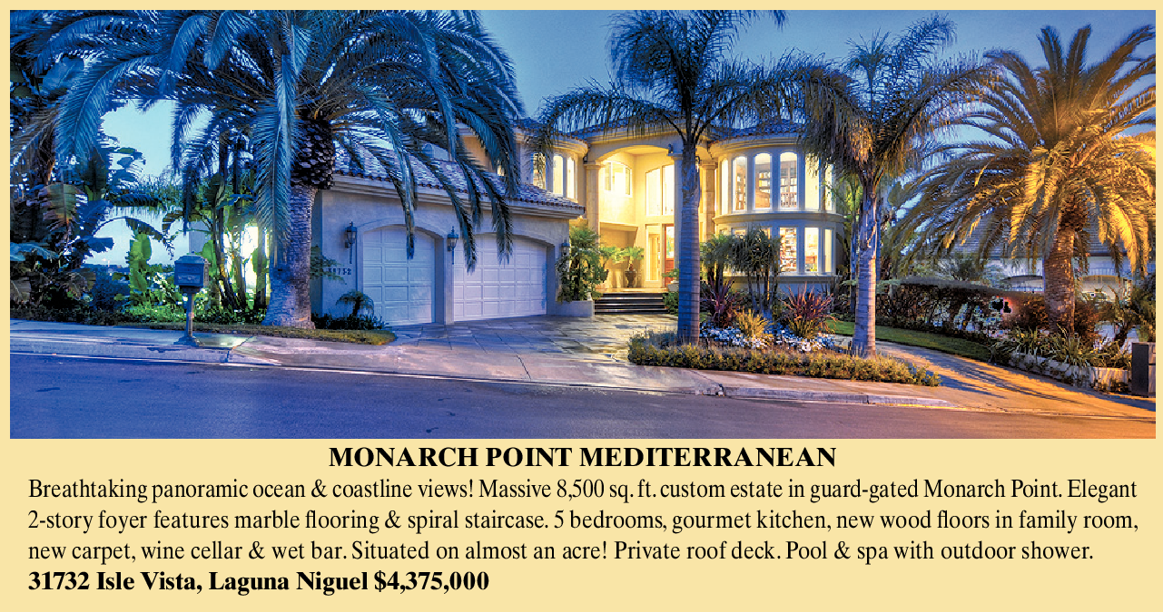 MONARCH POINT MEDITERRANEAN Breathtaking panoramic ocean & coastline views! Massive 8,500 sq. ft. custom estate in guard-gated Monarch Point. Elegant 2-story foyer features marble flooring & spiral staircase. 5 bedrooms, gourmet kitchen, new wood floors in family room, new carpet, wine cellar & wet bar. Situated on almost an acre! Private roof deck. Pool & spa with outdoor shower. 31732 Isle Vista, Laguna Niguel $4,375,000