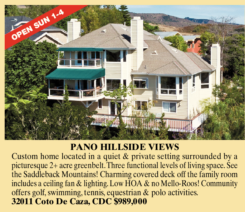PANO HILLSIDE VIEWS Custom home located in a quiet & private setting surrounded by a picturesque 2+ acre greenbelt.Three functional levels of living space. See the Saddleback Mountains! Charming covered deck off the family room includes a ceiling fan & lighting. Low HOA & no Mello-Roos! Community offers golf, swimming, tennis, equestrian & polo activities. 32011 Coto De Caza, CDC $989,000