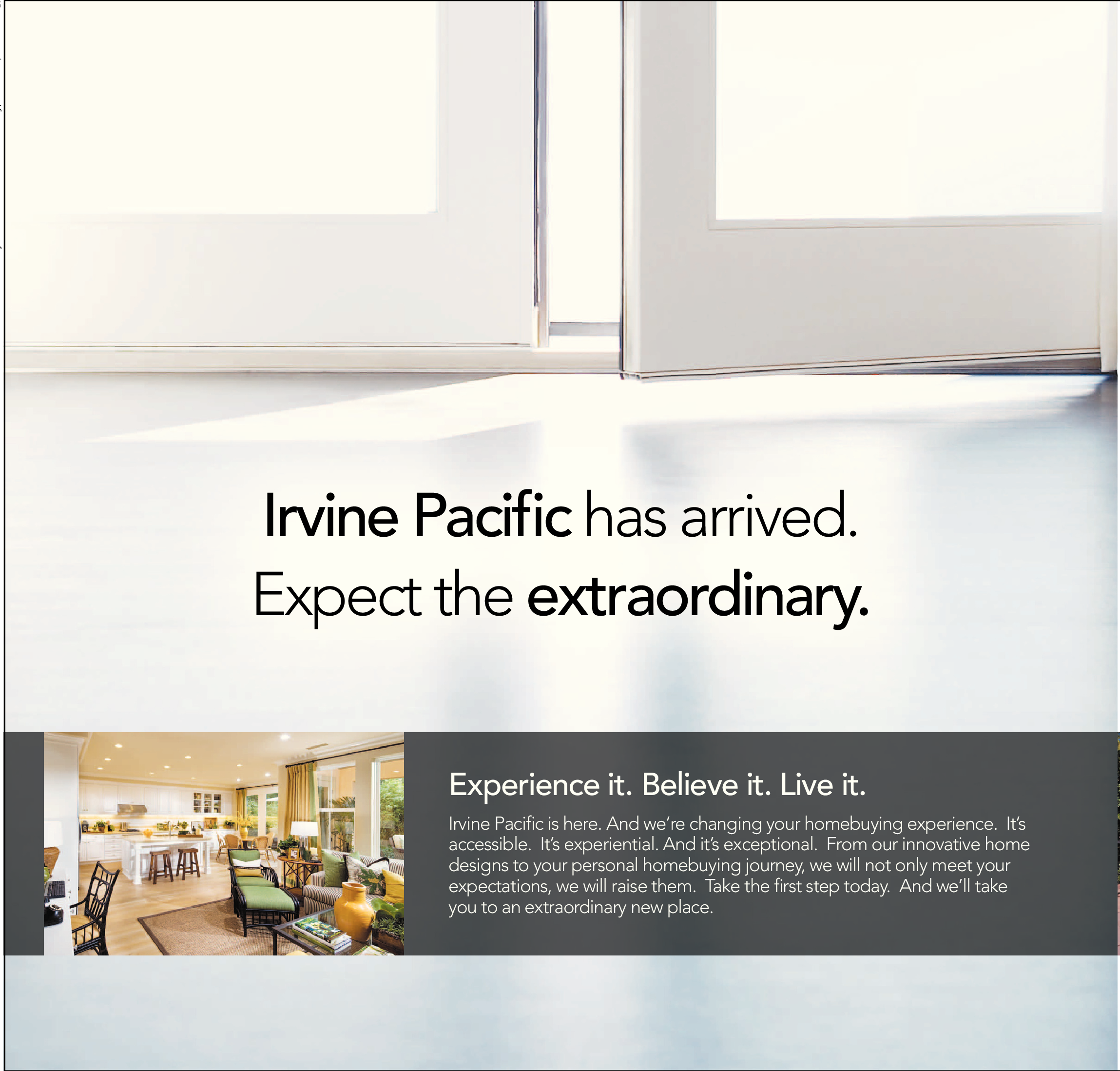 36 Irvine Pacific has arrived. Expect the extraordinary. Experience it. Believe it. Live it. Irvine Pacific is here. And we’re changing your homebuying experience. It’s accessible. It’s experiential. And it’s exceptional. From our innovative home designs to your personal homebuying journey, we will not only meet your expectations, we will raise them. Take the first step today. And we’ll take you to an extraordinary new place.