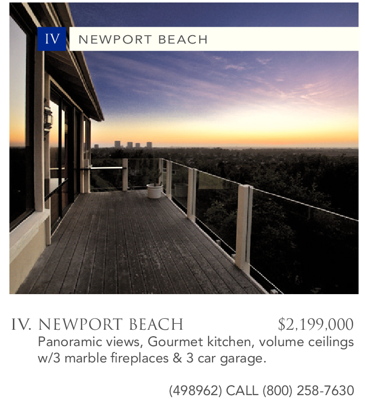 NEWPORT BEACH $2,199,000 Panoramic views, Gourmet kitchen, volume ceilings w/3 marble fireplaces & 3 car garage.