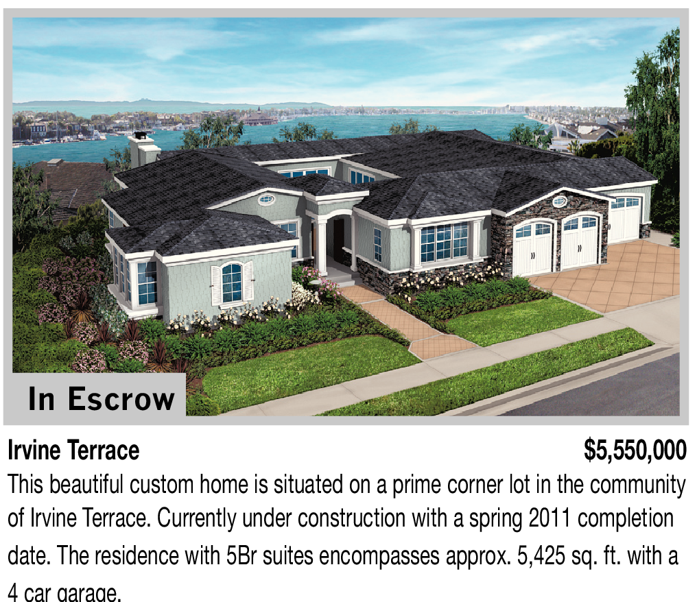 This beautiful custom home is situated on a prime corner lot in the community of Irvine Terrace. Currently under construction with a spring 2011 completion date. The residence with 5Br suites encompasses approx. 5,425 sq. ft. with a 4 car garage.