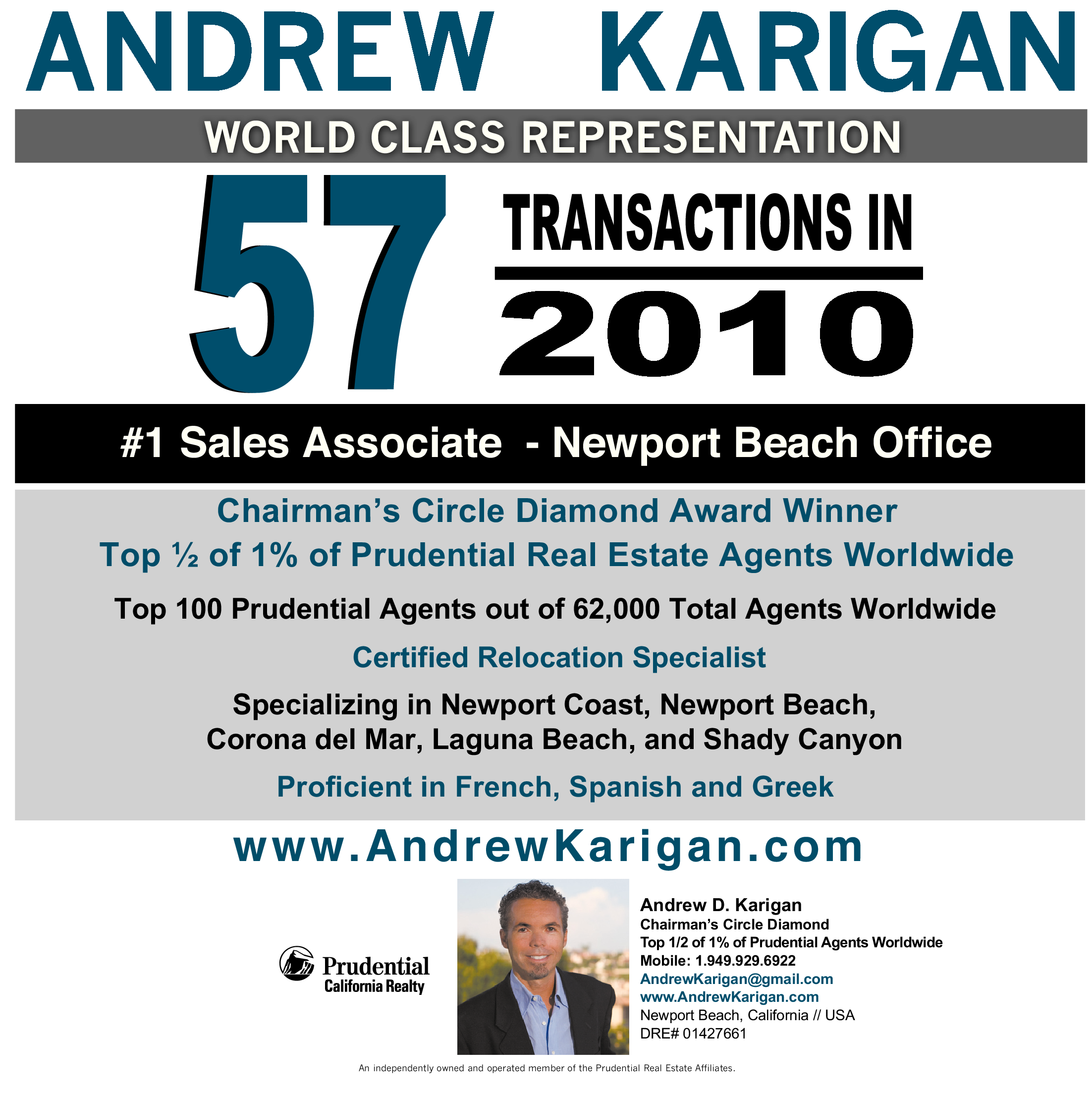 Andrew D. Karigan Chairman’s Circle Diamond Top 1/2 of 1% of Prudential Agents Worldwide Mobile: 1.949.929.6922 AndrewKarigan@gmail.com www.AndrewKarigan.com Newport Beach, California // USA DRE# 01427661