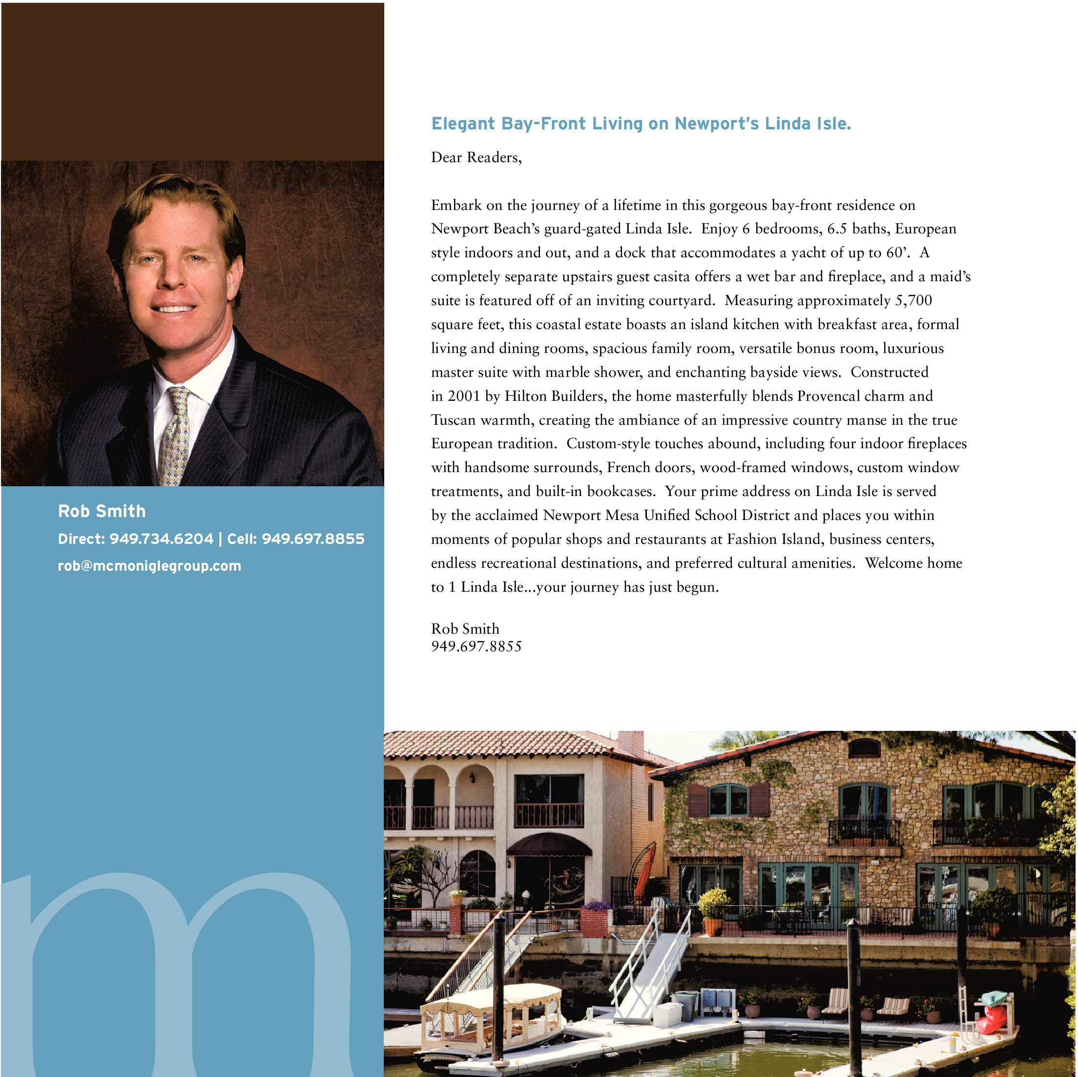 Rob Smith Direct: 949.734.6204 | Cell: 949.697.8855 rob@mcmoniglegroup.com Elegant Bay-Front Living on Newport’s Linda Isle. Dear Readers, Embark on the journey of a lifetime in this gorgeous bay-front residence on Newport Beach’s guard-gated Linda Isle. Enjoy 6 bedrooms, 6.5 baths, European style indoors and out, and a dock that accommodates a yacht of up to 60’. A completely separate upstairs guest casita offers a wet bar and fireplace, and a maid’s suite is featured off of an inviting courtyard. Measuring approximately 5,700 square feet, this coastal estate boasts an island kitchen with breakfast area, formal living and dining rooms, spacious family room, versatile bonus room, luxurious master suite with marble shower, and enchanting bayside views. Constructed in 2001 by Hilton Builders, the home masterfully blends Provencal charm and Tuscan warmth, creating the ambiance of an impressive country manse in the true European tradition. Custom-style touches abound, including four indoor fireplaces with handsome surrounds, French doors, wood-framed windows, custom window treatments, and built-in bookcases. Your prime address on Linda Isle is served by the acclaimed Newport Mesa Unified School District and places you within moments of popular shops and restaurants at Fashion Island, business centers, endless recreational destinations, and preferred cultural amenities. Welcome home to 1 Linda Isle...your journey has just begun. Rob Smith 949.697.8855