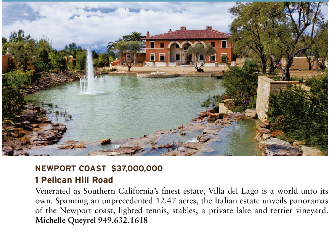 NEWPORT COAST $37,000,000 1 Pelican Hill Road Venerated as Southern California’s finest estate, Villa del Lago is a world unto its own. Spanning an unprecedented 12.47 acres, the Italian estate unveils panoramas of the Newport coast, lighted tennis, stables, a private lake and terrier vineyard. Michelle Queyrel 949.632.1618