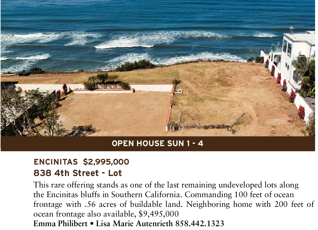 ENCINITAS $2,995,000 838 4th Street - Lot This rare offering stands as one of the last remaining undeveloped lots along the Encinitas bluffs in Southern California. Commanding 100 feet of ocean frontage with .56 acres of buildable land. Neighboring home with 200 feet of ocean frontage also available, $9,495,000 Emma Philibert • Lisa Marie Autenrieth 858.442.1323 OPEN HOUSE SUN 1 - 4