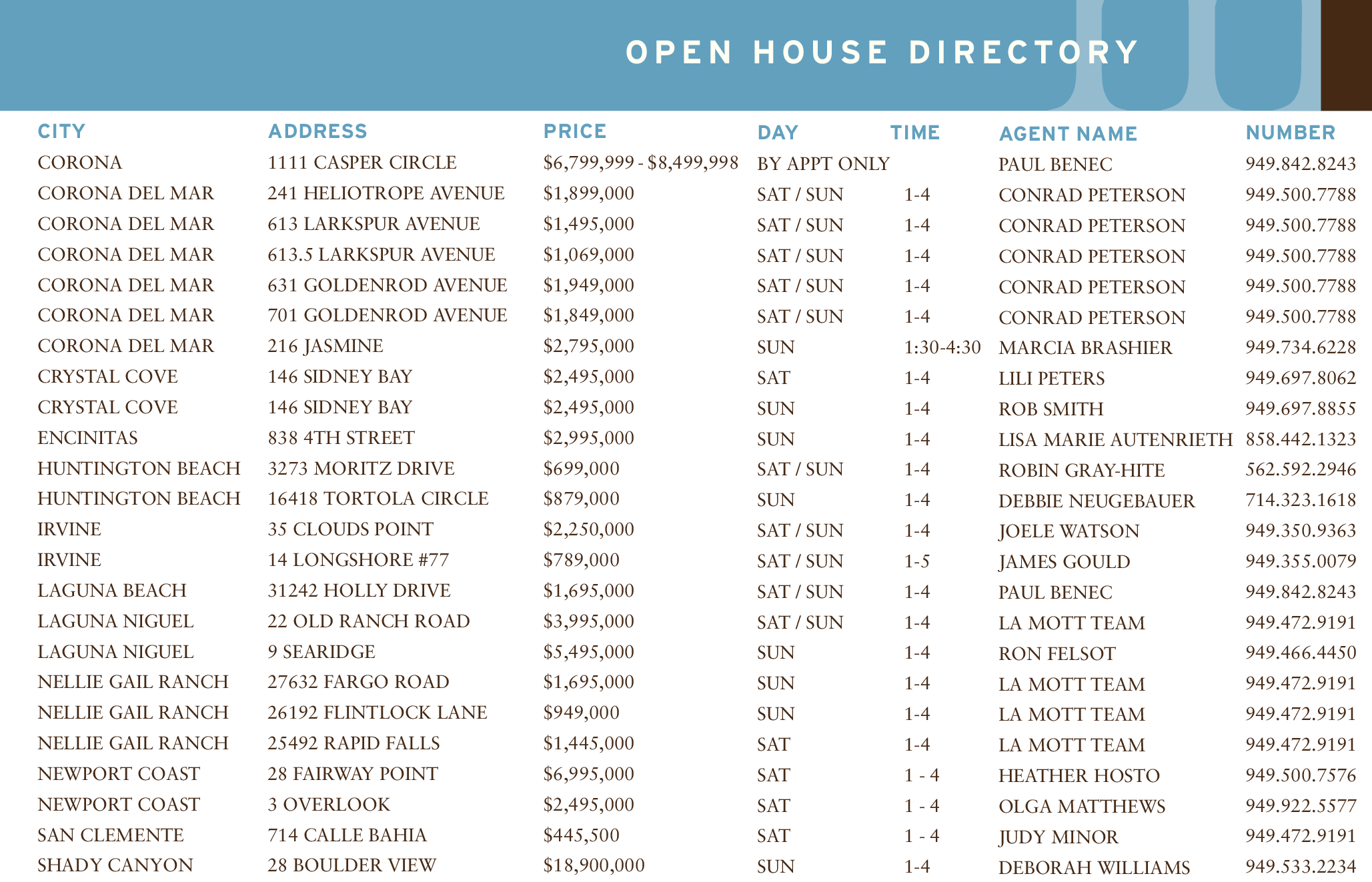 AGENT NAME NUMBER PAUL BENEC 949.842.8243 CONRAD PETERSON 949.500.7788 CONRAD PETERSON 949.500.7788 CONRAD PETERSON 949.500.7788 CONRAD PETERSON 949.500.7788 CONRAD PETERSON 949.500.7788 MARCIA BRASHIER 949.734.6228 LILI PETERS 949.697.8062 ROB SMITH 949.697.8855 LISA MARIE AUTENRIETH 858.442.1323 ROBIN GRAY-HITE 562.592.2946 DEBBIE NEUGEBAUER 714.323.1618 JOELE WATSON 949.350.9363 JAMES GOULD 949.355.0079 PAUL BENEC 949.842.8243 LA MOTT TEAM 949.472.9191 RON FELSOT 949.466.4450 LA MOTT TEAM 949.472.9191 LA MOTT TEAM 949.472.9191 LA MOTT TEAM 949.472.9191 HEATHER HOSTO 949.500.7576 OLGA MATTHEWS 949.922.5577 JUDY MINOR 949.472.9191 DEBORAH WILLIAMS 949.533.2234
