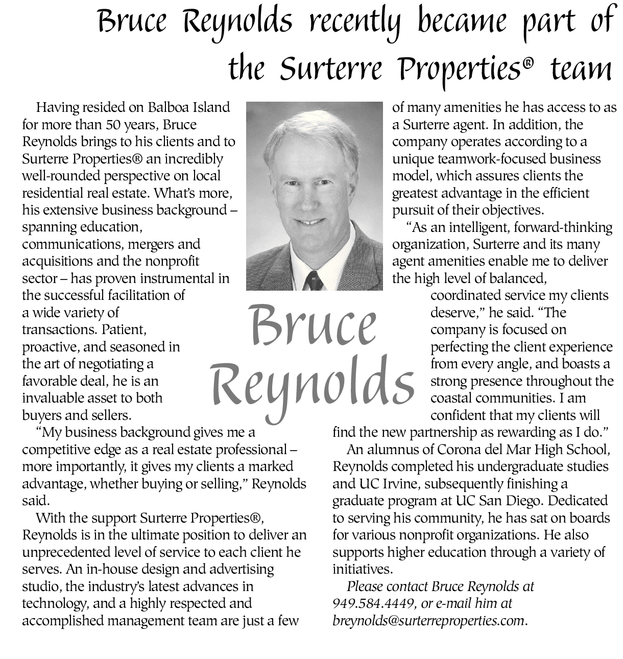 Having resided on Balboa Island for more than 50 years, Bruce Reynolds brings to his clients and to Surterre Properties® an incredibly well-rounded perspective on local residential real estate. What’s more, his extensive business background – spanning education, communications, mergers and acquisitions and the nonprofit sector – has proven instrumental in the successful facilitation of a wide variety of transactions. Patient, proactive, and seasoned in the art of negotiating a favorable deal, he is an