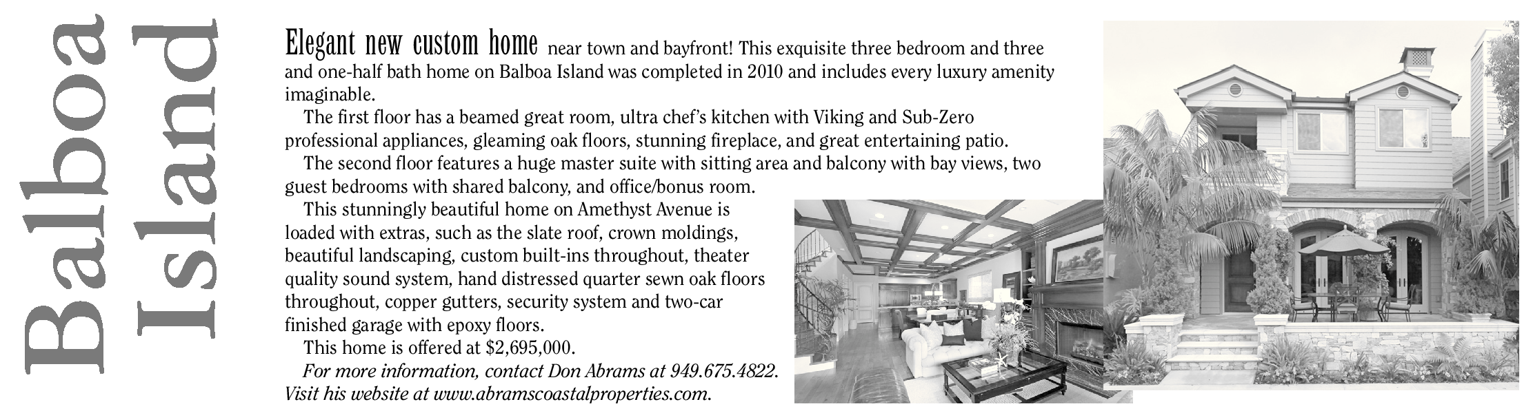Elegant new custom home near town and bayfront! This exquisite three bedroom and three and one-half bath home on Balboa Island was completed in 2010 and includes every luxury amenity imaginable. The first floor has a beamed great room, ultra chef’s kitchen with Viking and Sub-Zero professional appliances, gleaming oak floors, stunning fireplace, and great entertaining patio. The second floor features a huge master suite with sitting area and balcony with bay views, two guest bedrooms with shared balcony, and office/bonus room. This stunningly beautiful home on Amethyst Avenue is loaded with extras, such as the slate roof, crown moldings, beautiful landscaping, custom built-ins throughout, theater quality sound system, hand distressed quarter sewn oak floors throughout, copper gutters, security system and two-car finished garage with epoxy floors. This home is offered at $2,695,000. For more information, contact Don Abrams at 949.675.4822. Visit his website at www.abramscoastalproperties.com.