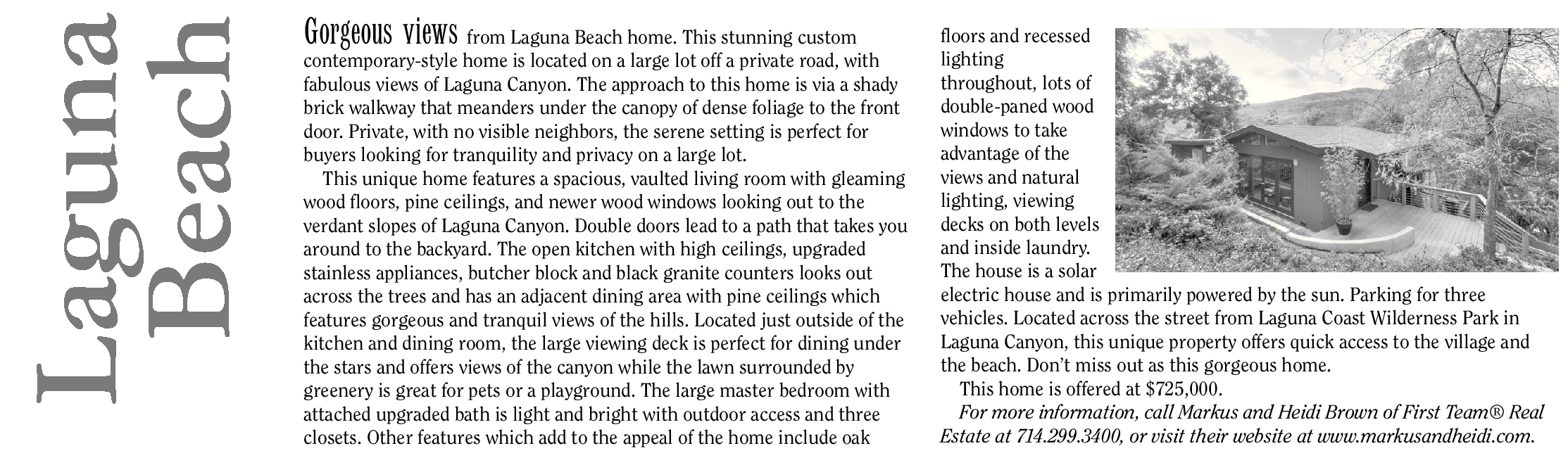 This home is offered at $725,000. For more information, call Markus and Heidi Brown of First Team® Real Estate at 714.299.3400, or visit their website at www.markusandheidi.com.
