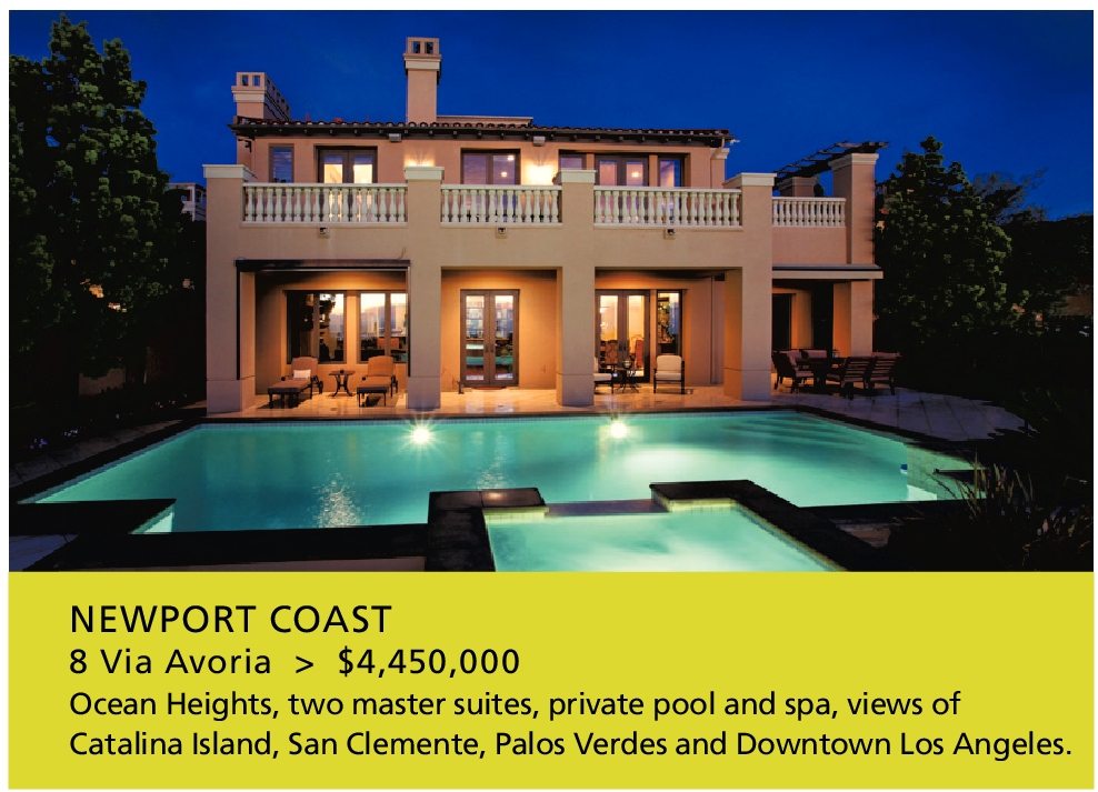 NEWPORT COAST 8 Via Avoria > $4,450,000 Ocean Heights, two master suites, private pool and spa, views of Catalina Island, San Clemente, Palos Verdes and Downtown Los Angeles.