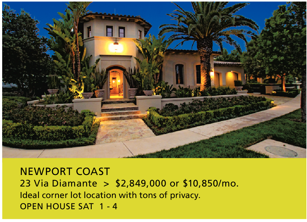 NEWPORT COAST 23 Via Diamante > $2,849,000 or $10,850/mo. Ideal corner lot location with tons of privacy. OPEN HOUSE SAT 1 - 4