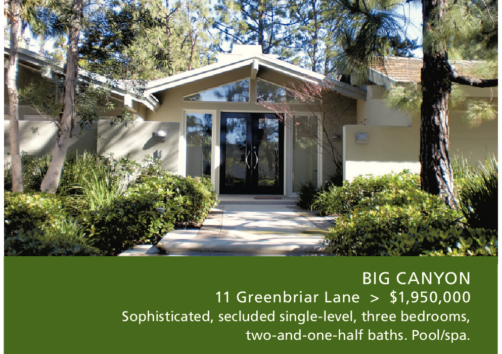 BIG CANYON 11 Greenbriar Lane > $1,950,000 Sophisticated, secluded single-level, three bedrooms, two-and-one-half baths. Pool/spa.