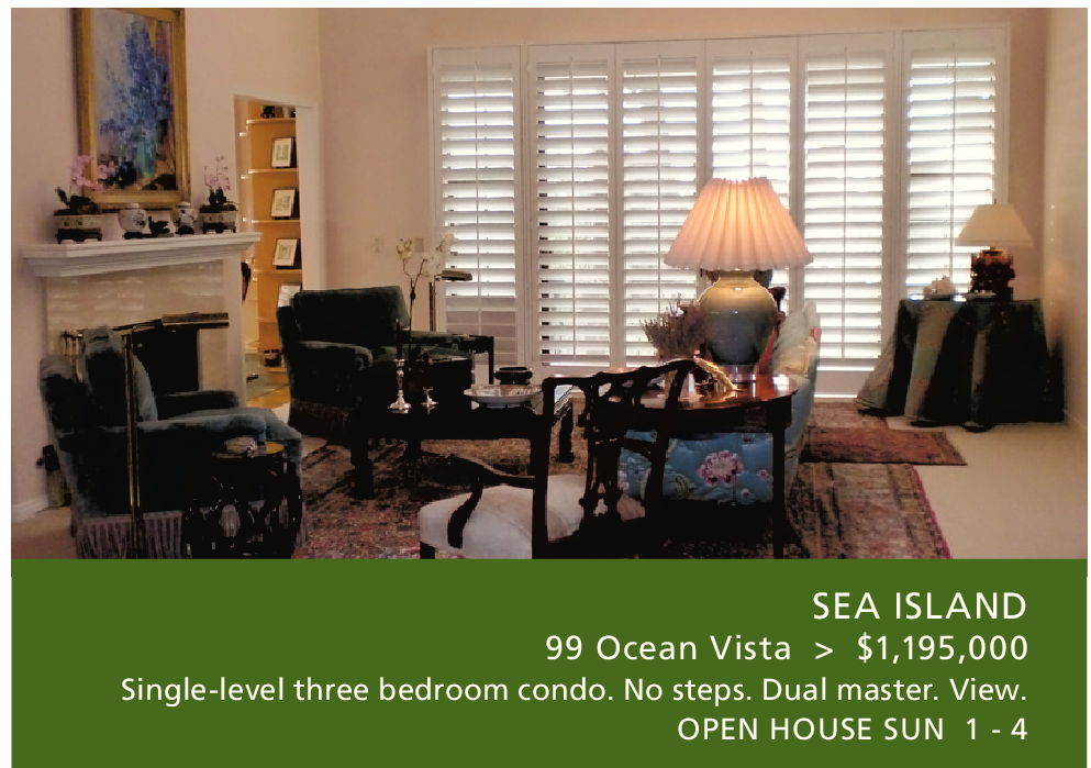 SEA ISLAND 99 Ocean Vista > $1,195,000 Single-level three bedroom condo. No steps. Dual master. View.