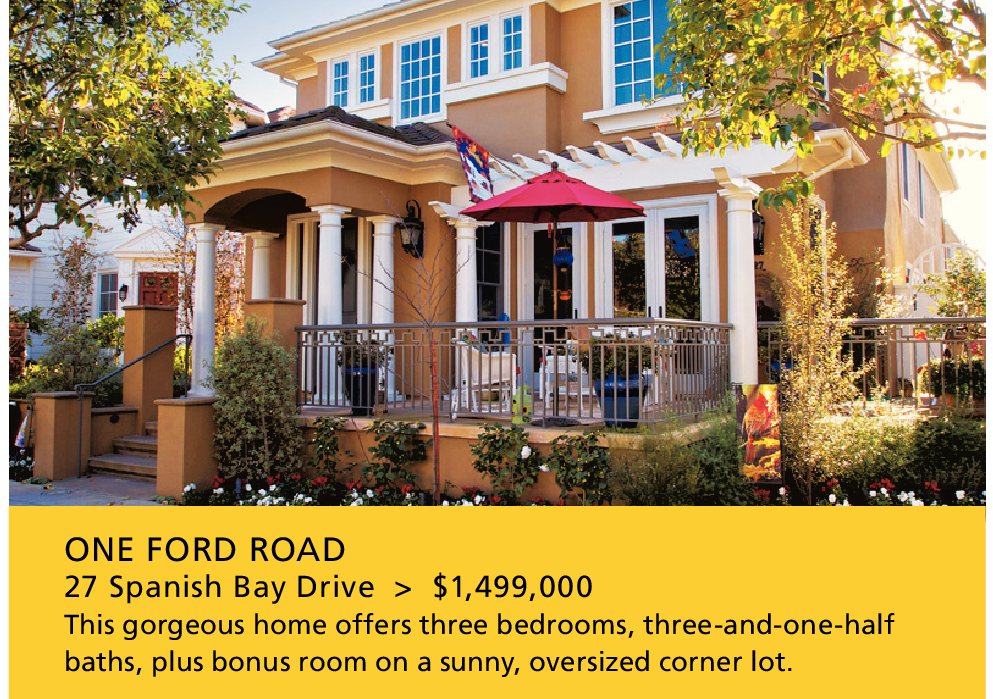 ONE FORD ROAD 27 Spanish Bay Drive > $1,499,000 This gorgeous home offers three bedrooms, three-and-one-half baths, plus bonus room on a sunny, oversized corner lot.