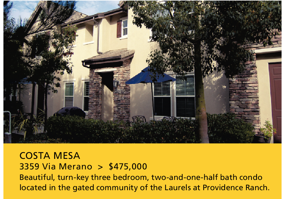 COSTA MESA 3359 Via Merano > $475,000 Beautiful, turn-key three bedroom, two-and-one-half bath condo located in the gated community of the Laurels at Providence Ranch.