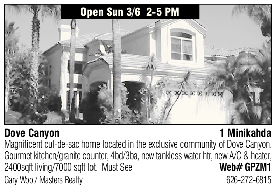 Open Sun 3/6 2-5 PM Dove Canyon 1 Minikahda Magnificent cul-de-sac home located in the exclusive community of Dove Canyon. Gourmet kitchen/granite counter, 4bd/3ba, new tankless water htr, new A/C & heater, 2400sqft living/7000 sqft lot. Must See Web# GPZM1 Gary Woo / Masters Realty 626-272-6815