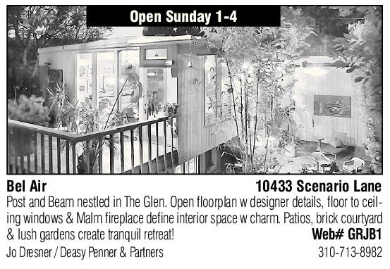 Bel Air 10433 Scenario Lane Post and Beam nestled in The Glen. Open floorplan w designer details, floor to ceiling windows & Malm fireplace define interior space w charm. Patios, brick courtyard & lush gardens create tranquil retreat! Web# GRJB1 Jo Dresner / Deasy Penner & Partners 310-713-8982
