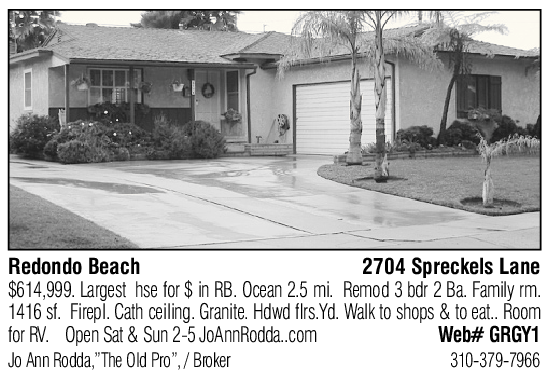Redondo Beach 2704 Spreckels Lane $614,999. Largest hse for $ in RB. Ocean 2.5 mi. Remod 3 bdr 2 Ba. Family rm. 1416 sf. Firepl. Cath ceiling. Granite. Hdwd flrs.Yd. Walk to shops & to eat.. Room for RV. Open Sat & Sun 2-5 JoAnnRodda..com Web# GRGY1 Jo Ann Rodda,”The Old Pro”, / Broker 310-379-7966