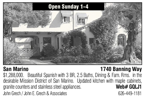 San Marino 1740 Banning Way $1,288,000. Beautiful Spanish with 3 BR, 2.5 Baths, Dining & Fam. Rms. in the desirable Mission District of San Marino. Updated kitchen with maple cabinets, granite counters and stainless steel appliances. Web# GQLJ1 John Grech / John E. Grech & Associates 626-449-1181