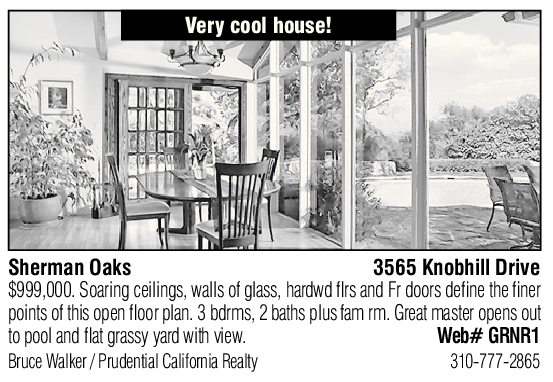 Sherman Oaks 3565 Knobhill Drive $999,000. Soaring ceilings, walls of glass, hardwd flrs and Fr doors define the finer points of this open floor plan. 3 bdrms, 2 baths plus fam rm. Great master opens out to pool and flat grassy yard with view. Web# GRNR1 Bruce Walker / Prudential California Realty 310-777-2865