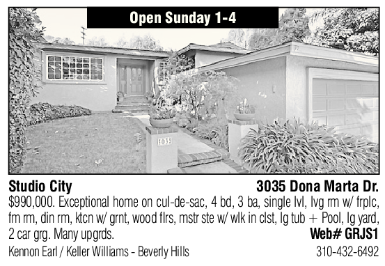 Studio City 3035 Dona Marta Dr. $990,000. Exceptional home on cul-de-sac, 4 bd, 3 ba, single lvl, lvg rm w/ frplc, fm rm, din rm, ktcn w/ grnt, wood flrs, mstr ste w/ wlk in clst, lg tub + Pool, lg yard, 2 car grg. Many upgrds. Web# GRJS1 Kennon Earl / Keller Williams - Beverly Hills 310-432-6492