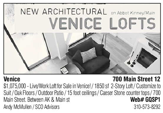 Venice 700 Main Street 12 $1,075,000 - Live/Work Loft for Sale in Venice! / 1850 sf 2-Story Loft / Customize to Suit / Oak Floors / Outdoor Patio / 15 foot ceilings / Caeser Stone counter tops / 700 Main Street. Between AK & Main st Web# GQSP1 Andy McMullen / SCO Advisors 310-573-8292