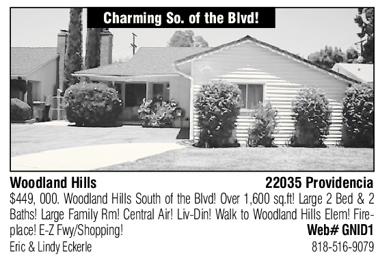 Charming So. of the Blvd! Woodland Hills 22035 Providencia $449, 000. Woodland Hills South of the Blvd! Over 1,600 sq.ft! Large 2 Bed & 2 Baths! Large Family Rm! Central Air! Liv-Din! Walk to Woodland Hills Elem! Fireplace! E-Z Fwy/Shopping! Web# GNID1 Eric & Lindy Eckerle 818-516-9079