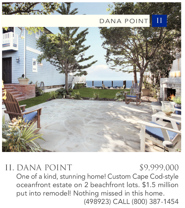 II. DANA POINT $9,999,000 One of a kind, stunning home! Custom Cape Cod-style oceanfront estate on 2 beachfront lots. $1.5 million put into remodel! Nothing missed in this home.