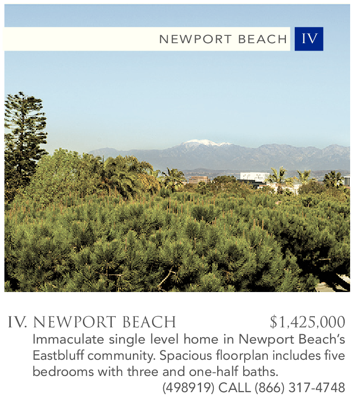 IV. NEWPORT BEACH $1,425,000 Immaculate single level home in Newport Beach’s Eastbluff community. Spacious floorplan includes five bedrooms with three and one-half baths.
