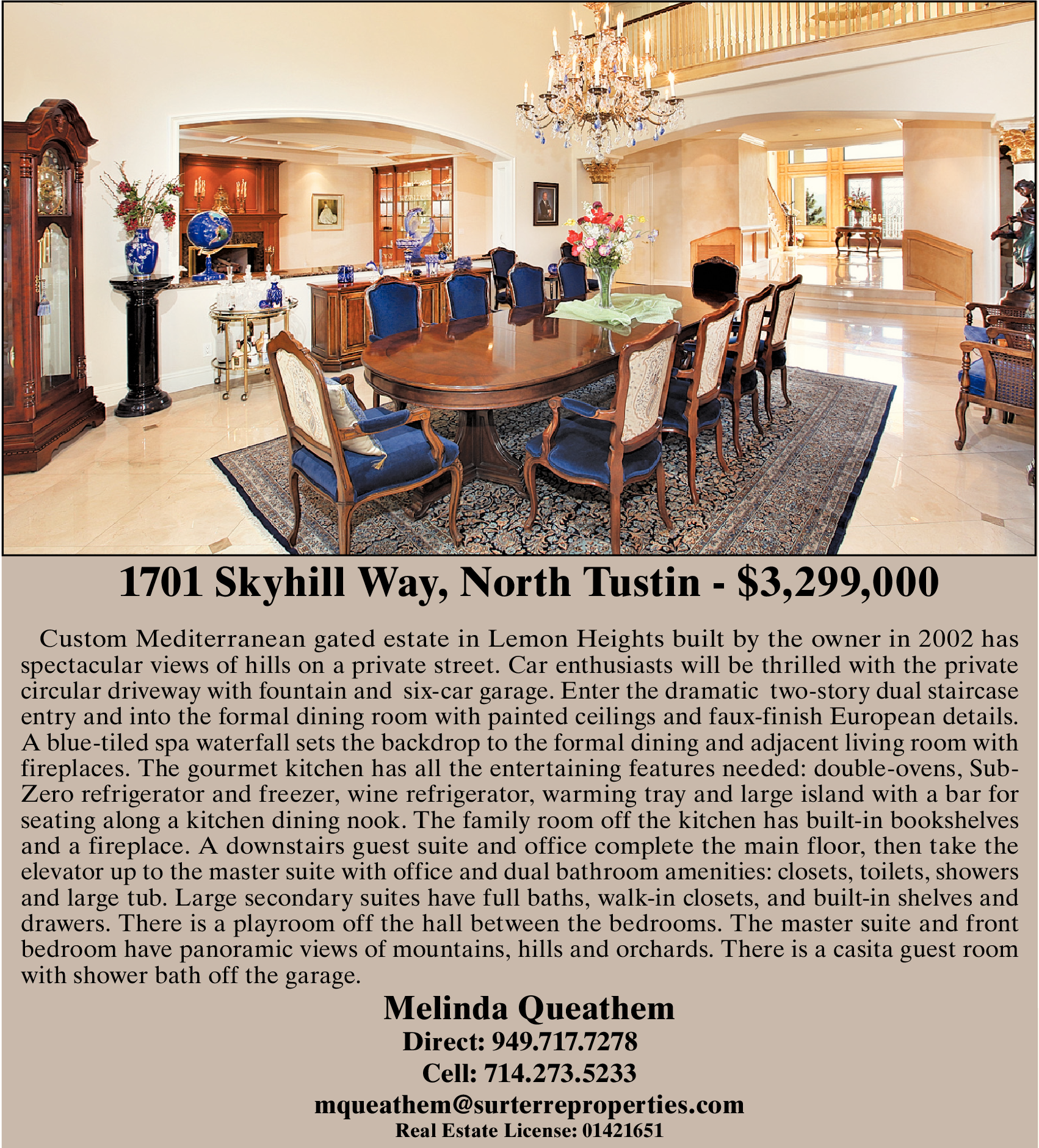 1701 Skyhill Way, North Tustin - $3,299,000 Custom Mediterranean gated estate in Lemon Heights built by the owner in 2002 has spectacular views of hills on a private street. Car enthusiasts will be thrilled with the private circular driveway with fountain and six-car garage. Enter the dramatic two-story dual staircase entry and into the formal dining room with painted ceilings and faux-finish European details. A blue-tiled spa waterfall sets the backdrop to the formal dining and adjacent living room with fireplaces. The gourmet kitchen has all the entertaining features needed: double-ovens, Sub- Zero refrigerator and freezer, wine refrigerator, warming tray and large island with a bar for seating along a kitchen dining nook. The family room off the kitchen has built-in bookshelves and a fireplace. A downstairs guest suite and office complete the main floor, then take the elevator up to the master suite with office and dual bathroom amenities: closets, toilets, showers and large tub. Large secondary suites have full baths, walk-in closets, and built-in shelves and drawers. There is a playroom off the hall between the bedrooms. The master suite and front bedroom have panoramic views of mountains, hills and orchards. There is a casita guest room with shower bath off the garage. Melinda Queathem Direct: 949.717.7278 Cell: 714.273.5233 mqueathem@surterreproperties.com Real Estate License: 01421651