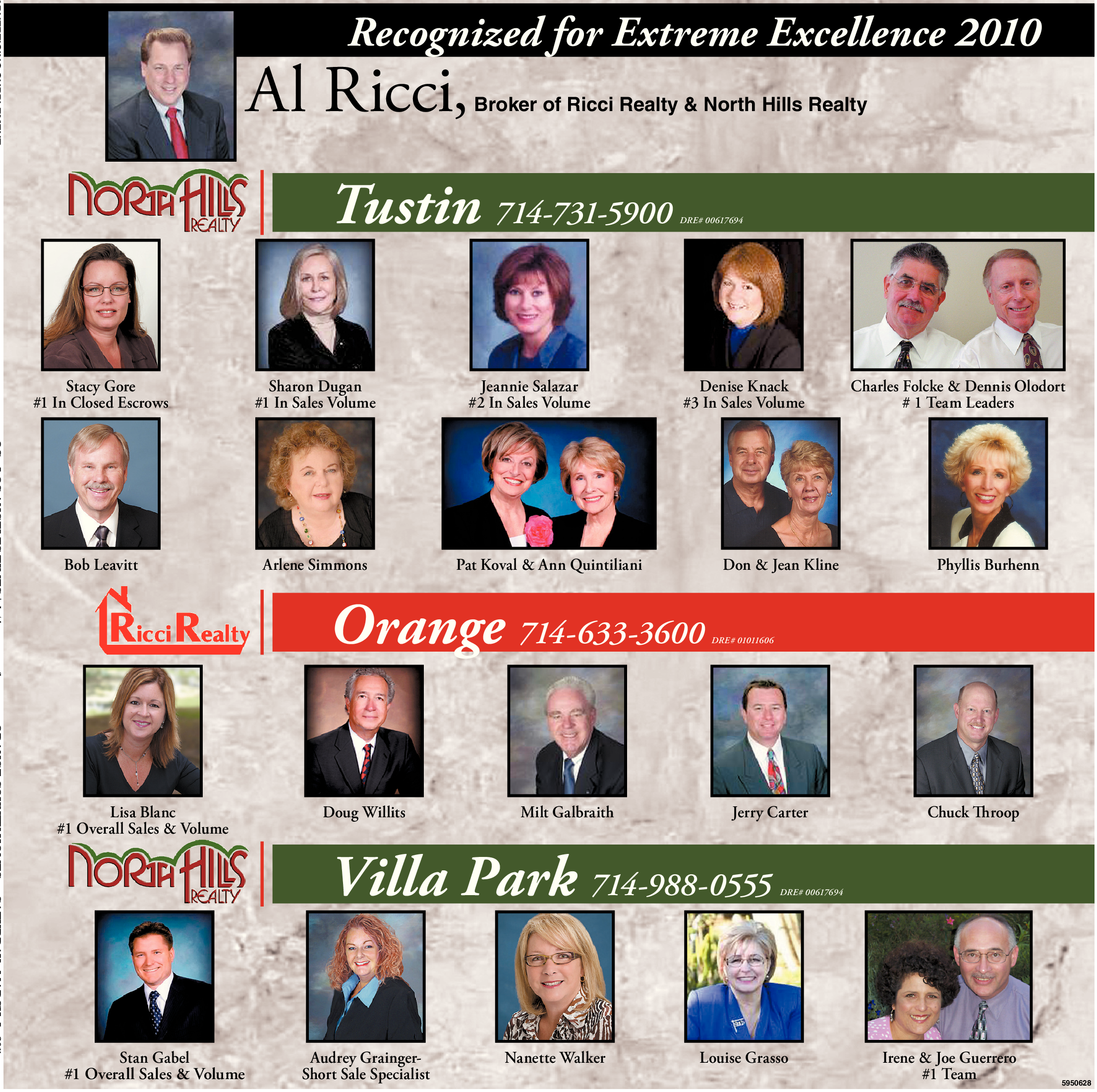 Stacy Gore #1 In Closed Escrows Lisa Blanc #1 Overall Sales & Volume Recognized for Extreme Excellence 2010 Al Ricci, Broker of Ricci Realty & North Hills Realty Sharon Dugan #1 In Sales Volume Tustin 714-731-5900 DRE# 00617694 Jeannie Salazar #2 In Sales Volume Denise Knack #3 In Sales Volume Orange 714-633-3600 DRE# 01011606 Doug Willits Milt Galbraith Jerry Carter Chuck Throop Villa Park 714-988-0555 DRE# 00617694 Charles Folcke & Dennis Olodort # 1 Team Leaders Bob Leavitt Arlene Simmons Pat Koval & Ann Quintiliani Don & Jean Kline Phyllis Burhenn Stan Gabel #1 Overall Sales & Volume Audrey Grainger- Short Sale Specialist Nanette Walker Louise Grasso Irene & Joe Guerrero #1 Team 5950628