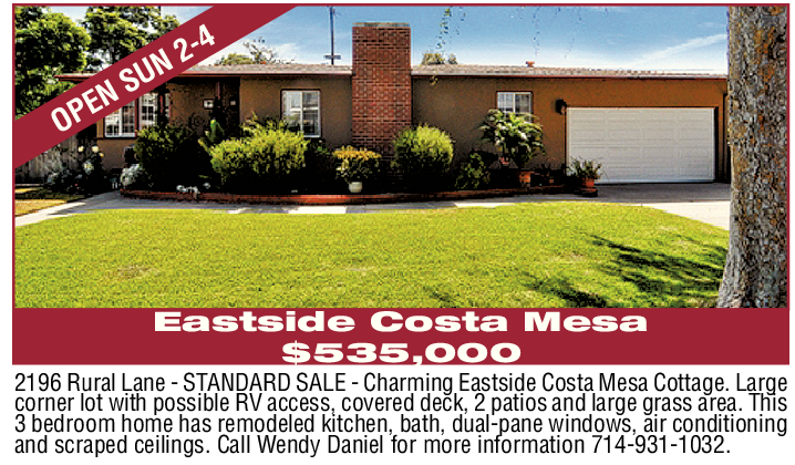 Eastside Costa Mesa $535,000 2196 Rural Lane - STANDARD SALE - Charming Eastside Costa Mesa Cottage. Large corner lot with possible RV access, covered deck, 2 patios and large grass area. This 3 bedroom home has remodeled kitchen, bath, dual-pane windows, air conditioning and scraped ceilings. Call Wendy Daniel for more information 714-931-1032.