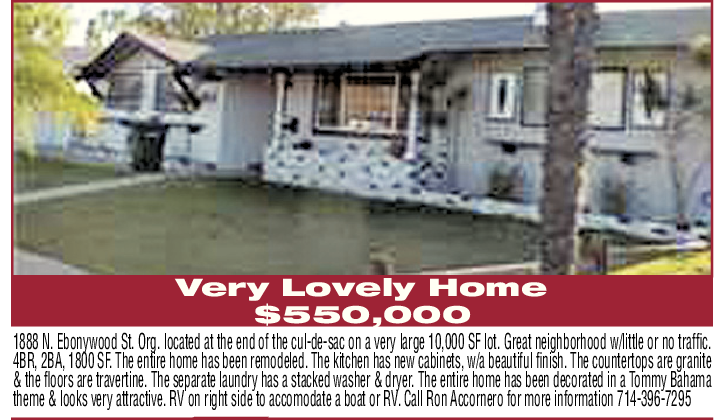 Very Lovely Home $550,000 1888 N. Ebonywood St. Org. located at the end of the cul-de-sac on a very large 10,000 SF lot. Great neighborhood w/little or no traffic. 4BR, 2BA, 1800 SF. The entire home has been remodeled. The kitchen has new cabinets, w/a beautiful finish. The countertops are granite & the floors are travertine. The separate laundry has a stacked washer & dryer. The entire home has been decorated in a Tommy Bahama theme & looks very attractive. RV on right side to accomodate a boat or RV. Call Ron Accornero for more information 714-396-7295