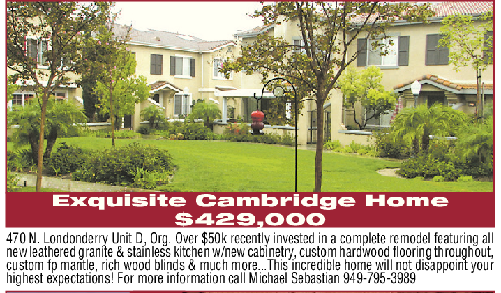 Exquisite Cambridge Home $429,000 470 N. Londonderry Unit D, Org. Over $50k recently invested in a complete remodel featuring all new leathered granite & stainless kitchen w/new cabinetry, custom hardwood flooring throughout, custom fp mantle, rich wood blinds & much more...This incredible home will not disappoint your highest expectations! For more information call Michael Sebastian 949-795-3989
