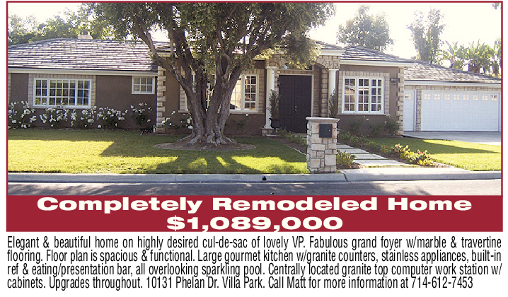 Completely Remodeled Home $1,089,000 Elegant & beautiful home on highly desired cul-de-sac of lovely VP. Fabulous grand foyer w/marble & travertine flooring. Floor plan is spacious & functional. Large gourmet kitchen w/granite counters, stainless appliances, built-in ref & eating/presentation bar, all overlooking sparkling pool. Centrally located granite top computer work station w/ cabinets. Upgrades throughout. 10131 Phelan Dr. Villa Park. Call Matt for more information at 714-612-7453