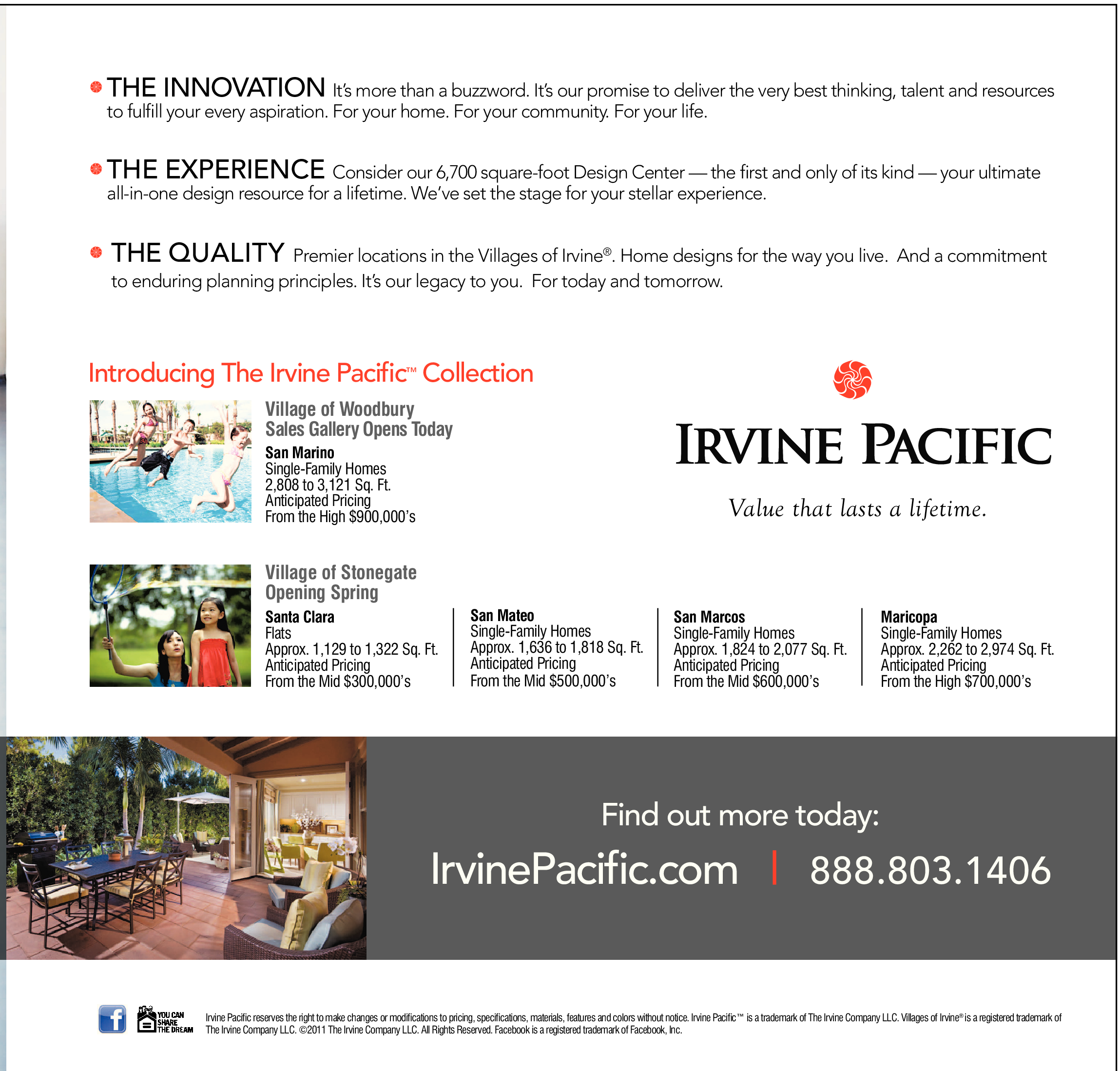 Irvine Pacific reserves the right to make changes or modifications to pricing, specifications, materials, features and colors without notice. Irvine Pacific™ is a trademark of The Irvine Company LLC. Villages of Irvine ® is a registered trademark of The Irvine Company LLC. ©2011 The Irvine Company LLC. All Rights Reserved. Facebook is a registered trademark of Facebook, Inc.