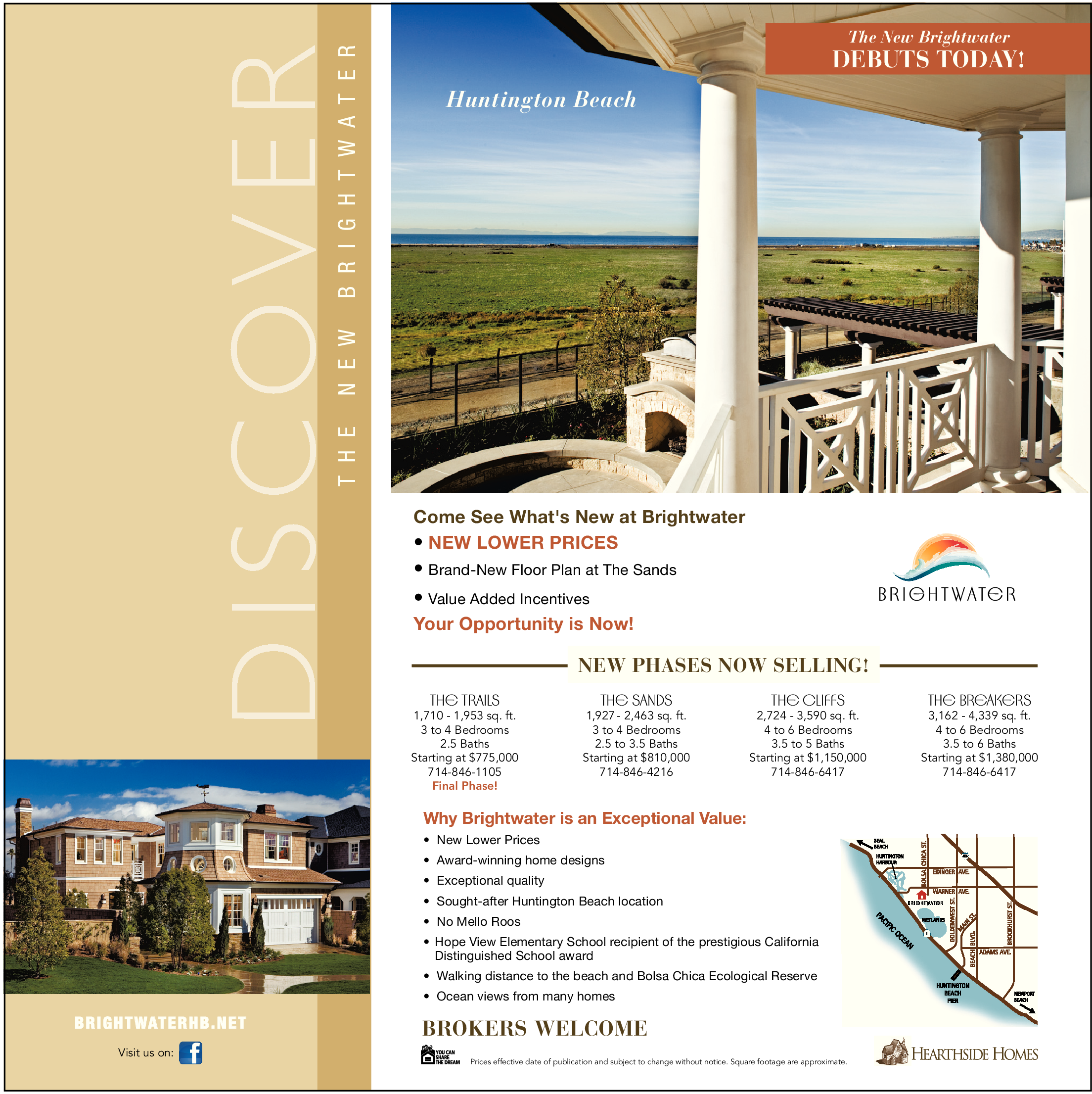 BRIGHTWATERHB.NET Visit us on: Huntington Beach Come See What's New at Brightwater • NEW LOWER PRICES • Brand-New Floor Plan at The Sands • Value Added Incentives Your Opportunity is Now! the trails 1,710 - 1,953 sq. ft. 3 to 4 Bedrooms 2.5 Baths Starting at $775,000 714-846-1105 Final Phase! the sands 1,927 - 2,463 sq. ft. 3 to 4 Bedrooms 2.5 to 3.5 Baths Starting at $810,000 714-846-4216 Why Brightwater is an Exceptional Value: the cliffs 2,724 - 3,590 sq. ft. 4 to 6 Bedrooms 3.5 to 5 Baths Starting at $1,150,000 714-846-6417 • New Lower Prices • Award-winning home designs • Exceptional quality • Sought-after Huntington Beach location • No Mello Roos • Hope View Elementary School recipient of the prestigious California Distinguished School award • Walking distance to the beach and Bolsa Chica Ecological Reserve • Ocean views from many homes BROKERS WELCOME NEW PHASES NOW SELLING! Prices effective date of publication and subject to change without notice. Square footage are approximate. The New Brightwater DEBUTS TODAY! the breakers 3,162 - 4,339 sq. ft. 4 to 6 Bedrooms 3.5 to 6 Baths Starting at $1,380,000 714-846-6417