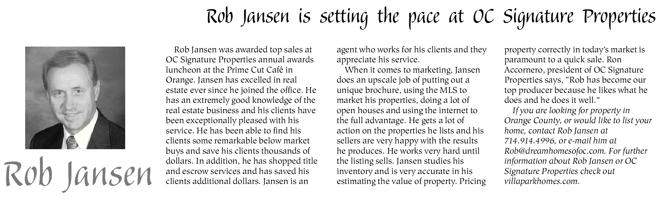 Rob Jansen Rob Jansen is setting the pace at OC Signature Properties Rob Jansen was awarded top sales at OC Signature Properties annual awards luncheon at the Prime Cut Café in Orange. Jansen has excelled in real estate ever since he joined the office. He has an extremely good knowledge of the real estate business and his clients have been exceptionally pleased with his service. He has been able to find his clients some remarkable below market buys and save his clients thousands of dollars. In addition, he has shopped title and escrow services and has saved his clients additional dollars. Jansen is an agent who works for his clients and they appreciate his service. When it comes to marketing, Jansen does an upscale job of putting out a unique brochure, using the MLS to market his properties, doing a lot of open houses and using the internet to the full advantage. He gets a lot of action on the properties he lists and his sellers are very happy with the results he produces. He works very hard until the listing sells. Jansen studies his inventory and is very accurate in his estimating the value of property. Pricing property correctly in today’s market is paramount to a quick sale. Ron Accornero, president of OC Signature Properties says, “Rob has become our top producer because he likes what he does and he does it well.” If you are looking for property in Orange County, or would like to list your home, contact Rob Jansen at 714.914.4996, or e-mail him at Rob@dreamhomesofoc.com. For further information about Rob Jansen or OC Signature Properties check out villaparkhomes.com.