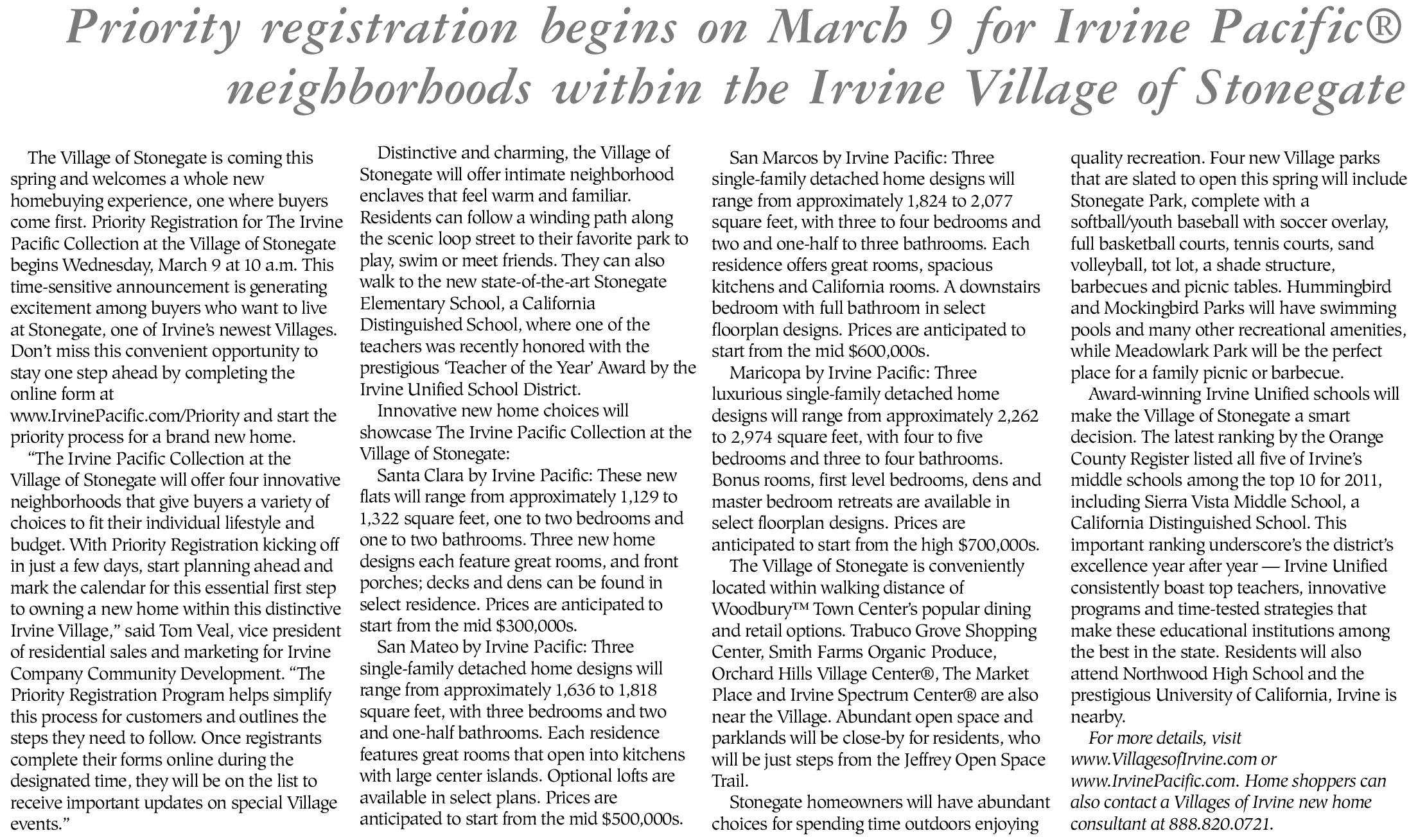 The Village of Stonegate is coming this spring and welcomes a whole new homebuying experience, one where buyers come first. Priority Registration for The Irvine Pacific Collection at the Village of Stonegate begins Wednesday, March 9 at 10 a.m. This time-sensitive announcement is generating excitement among buyers who want to live at Stonegate, one of Irvine’s newest Villages. Don’t miss this convenient opportunity to stay one step ahead by completing the online form at www.IrvinePacific.com/Priority and start the priority process for a brand new home.