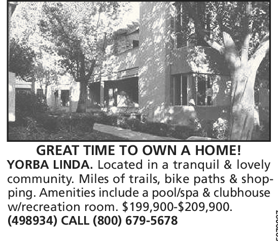 YORBA LINDA. Located in a tranquil & lovely community. Miles of trails, bike paths & shopping. Amenities include a pool/spa & clubhouse w/recreation room. $199,900-$209,900. (498934) CALL (800) 679-5678