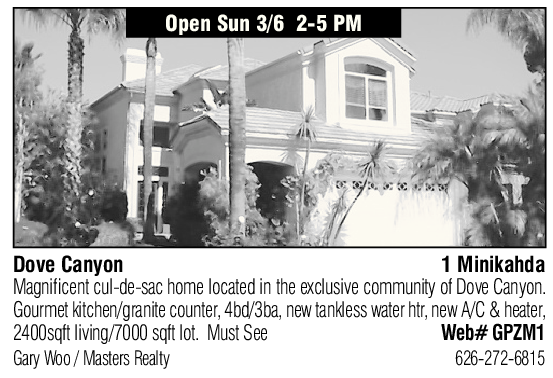 Open Sun 3/6 2-5 PM Dove Canyon 1 Minikahda Magnificent cul-de-sac home located in the exclusive community of Dove Canyon. Gourmet kitchen/granite counter, 4bd/3ba, new tankless water htr, new A/C & heater, 2400sqft living/7000 sqft lot. Must See Web# GPZM1 Gary Woo / Masters Realty 626-272-6815