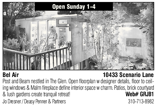 Open Sunday 1-4 Bel Air 10433 Scenario Lane Post and Beam nestled in The Glen. Open floorplan w designer details, floor to ceiling windows & Malm fireplace define interior space w charm. Patios, brick courtyard & lush gardens create tranquil retreat! Web# GRJB1 Jo Dresner / Deasy Penner & Partners 310-713-8982 See also