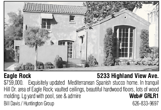 Eagle Rock 5233 Highland View Ave. $759,000. Exquisitely updated Mediterranean Spanish stucco home. In tranquil Hill Dr. area of Eagle Rock; vaulted ceilings, beautiful hardwood floors, lots of wood molding. Lg yard with pool, see & admire Web# GRLR1 Bill Davis / Huntington Group 626-833-9697