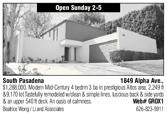 Open Sunday 2-5 South Pasadena 1849 Alpha Ave., $1,288,000. Modern Mid-Century 4 bedrm 3 ba in prestigious Altos area, 2,249 ft &9,170 lot.Tastefully remodeled w/clean & simple lines, luscious back & side yards & an upper 540 ft deck. An oasis of calmness. Web# GROX1 Beatrice Wong / Li and Associates 626-823-9911