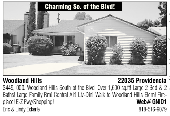 Charming So. of the Blvd! Woodland Hills 22035 Providencia $449, 000. Woodland Hills South of the Blvd! Over 1,600 sq.ft! Large 2 Bed & 2 Baths! Large Family Rm! Central Air! Liv-Din! Walk to Woodland Hills Elem! Fireplace! E-Z Fwy/Shopping! Web# GNID1 Eric & Lindy Eckerle 818-516-9079 15
