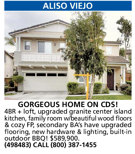 ALISO VIEJO GORGEOUS HOME ON CDS! 4BR + loft, upgraded granite center island kitchen, family room w/beautiful wood floors & cozy FP, secondary BA’s have upgraded flooring, new hardware & lighting, built-in outdoor BBQ! $589,900. (498483) CALL (800) 387-1455