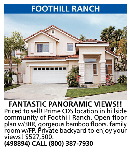 Priced to sell! Prime CDS location in hillside community of Foothill Ranch. Open floor plan w/3BR, gorgeous bamboo floors, family room w/FP. Private backyard to enjoy your views! $527,500. (498894) CALL (800) 387-7930