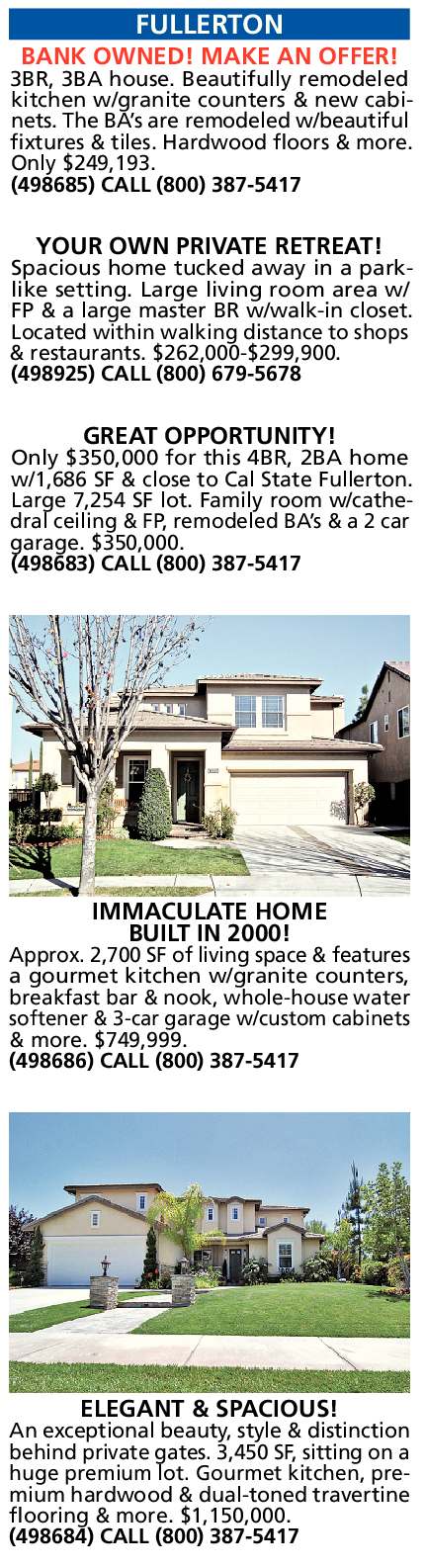 Only $350,000 for this 4BR, 2BA home w/1,686 SF & close to Cal State Fullerton. Large 7,254 SF lot. Family room w/cathedral ceiling & FP, remodeled BA’s & a 2 car garage. $350,000. (498683) CALL (800) 387-5417