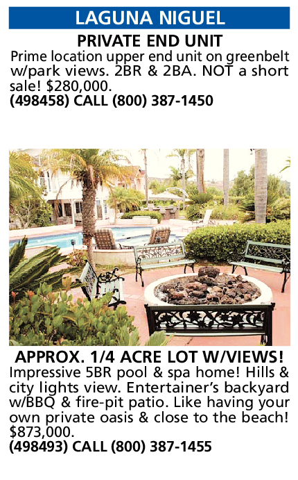 LAGUNA NIGUEL PRIVATE END UNIT Prime location upper end unit on greenbelt w/park views. 2BR & 2BA. NOT a short sale! $280,000. (498458) CALL (800) 387-1450